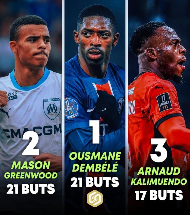 马赛4比2大胜雷恩,格林伍德上半场2球1助(射失1粒点球),追平登贝莱,以21球并列,登贝莱在对欧塞尔的比赛未能进球。不过格林伍德有1/3的进球是点球(7点),而登贝莱只进了1个点球(并且进球效率更高,助攻也更多),按照规则登贝莱获得法甲金靴奖。
