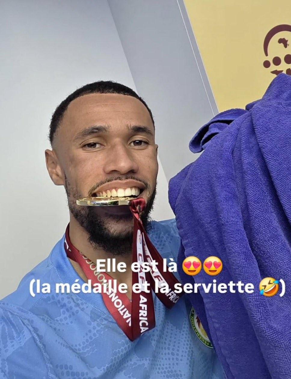 其实早在颁奖典礼结束后的更衣室里,这位26岁的门将就曾用自己的方式,调侃过这场“毛巾风波”。当时,他在社交媒体上发布了一张照片,照片中的他嘴里叼着沉甸甸的非洲杯冠军奖牌,还配文说道:“它在这里(奖牌和毛巾都在哦)”,后面还附上了一个大笑的表情符号。