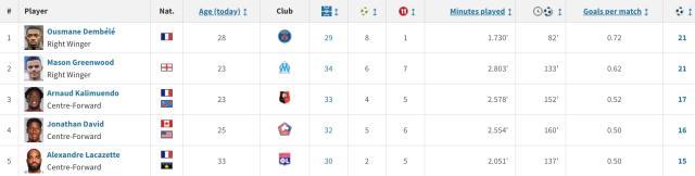 马赛4比2大胜雷恩,格林伍德上半场2球1助(射失1粒点球),追平登贝莱,以21球并列,登贝莱在对欧塞尔的比赛未能进球。不过格林伍德有1/3的进球是点球(7点),而登贝莱只进了1个点球(并且进球效率更高,助攻也更多),按照规则登贝莱获得法甲金靴奖。